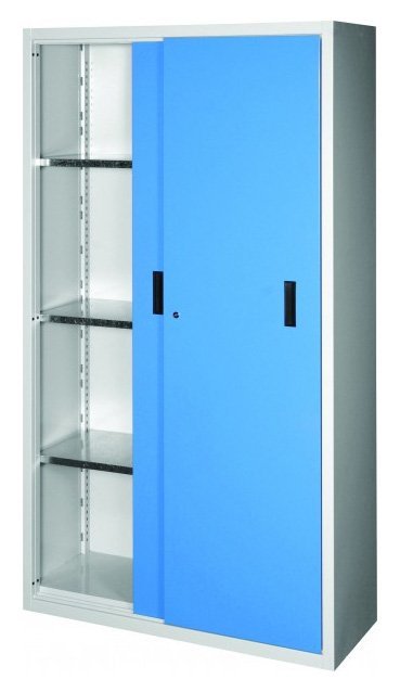 Skříň s posuvnými dveřmi, 3x police stavitelná po 25 mm (pozink), plná dvířka, nosnost 600 kg. Výška 1950 x šířka 1044 x hloubka 405 mm. Plné dveře možno nahradit posuvnými skleněnými dveřmi.