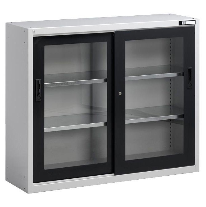 Skříň s posuvnými dveřmi, 2x police stavitelná po 25 mm (pozink), plná dvířka, nosnost 300 kg. Výška 1000 x šířka 1044 x hloubka 405 mm, skleněné dveře v ocelovém rámu.