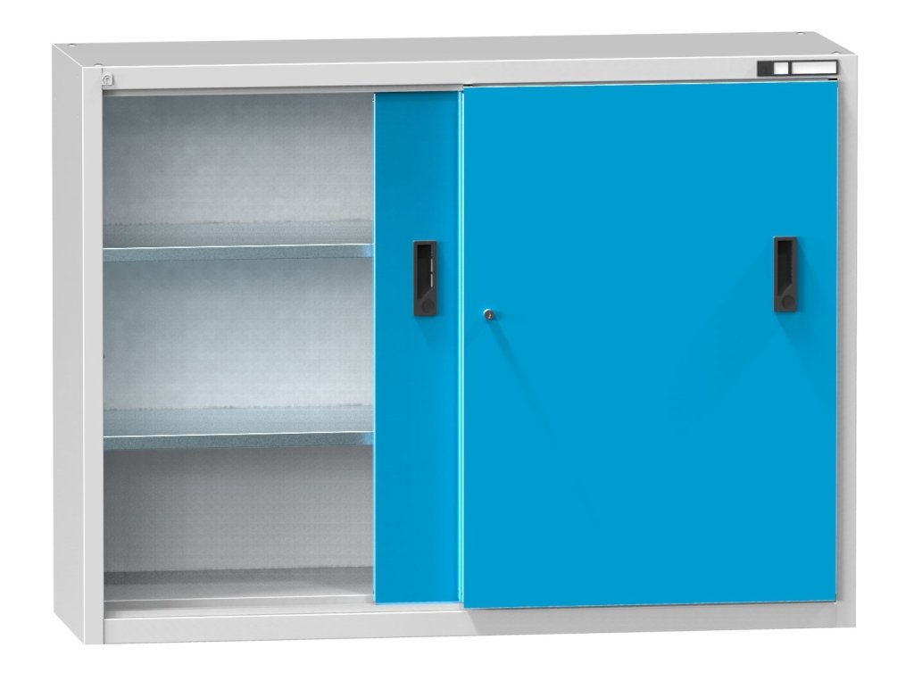 Skříň s posuvnými dveřmi, 2x police stavitelná po 25 mm (pozink), plná dvířka, nosnost 300 kg. Výška 1000 x šířka 1044 x hloubka 405 mm. Plné dveře možno nahradit posuvnými skleněnými dveřmi.
