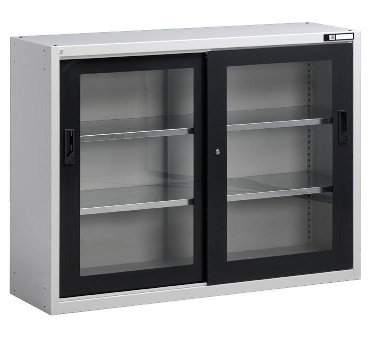 Skříň s posuvnými dveřmi, 2x police stavitelná po 25 mm (pozink), plná dvířka, nosnost 300 kg. Výška 1000 x šířka 1350 x hloubka 405 mm, skleněné dveře v ocelovém rámu.