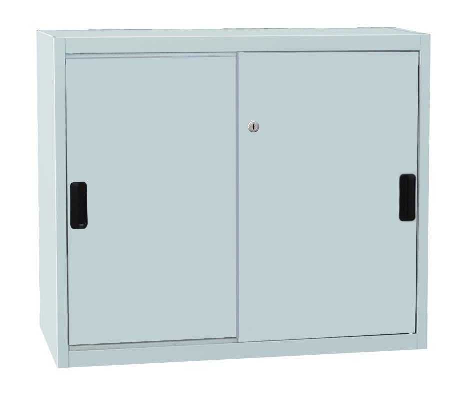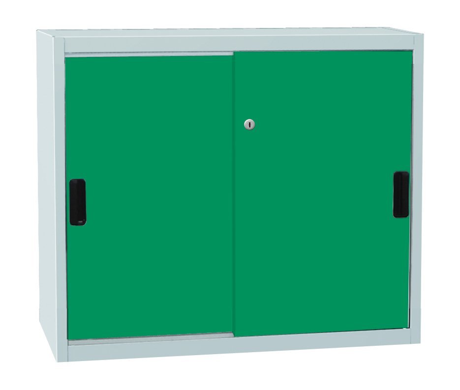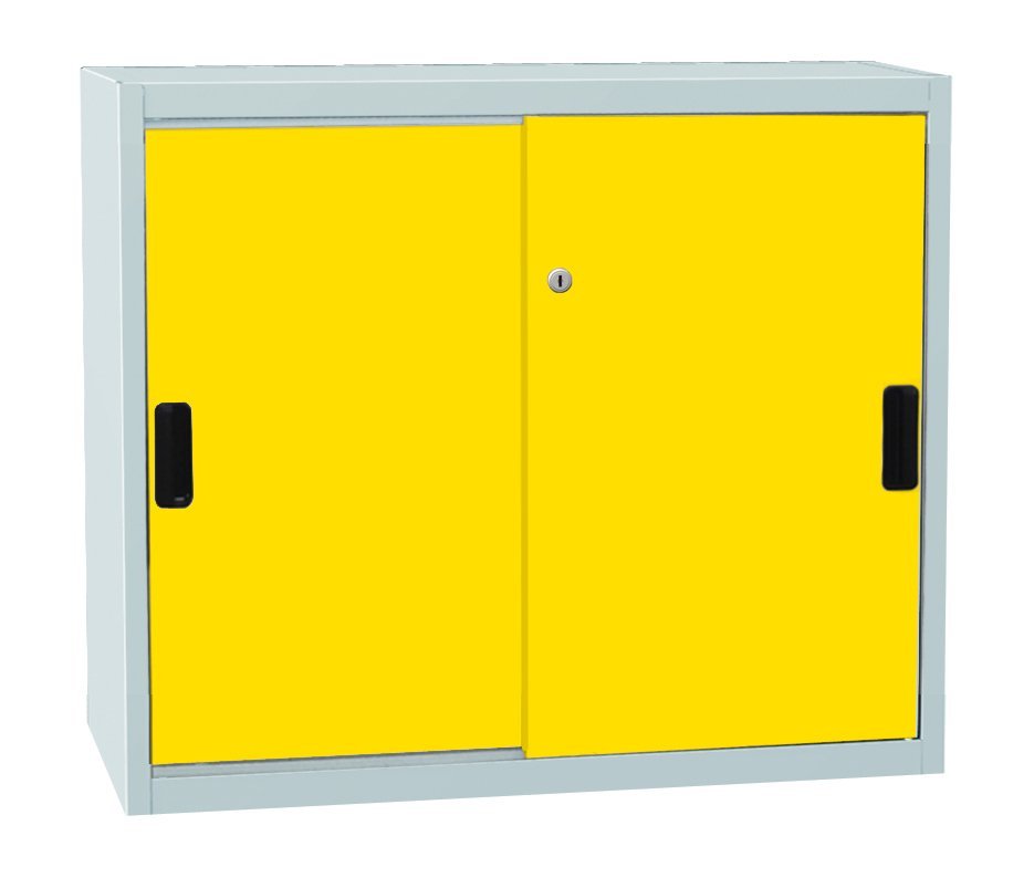 Kovová skříň s posuvnými dveřmi, výška 800 x šířka 950 x hloubka 400 mm, 1x stavitelná police. Posuvné dveře se zámkem v několika barevných odstínech, korpus světle šedý RAL 7035.