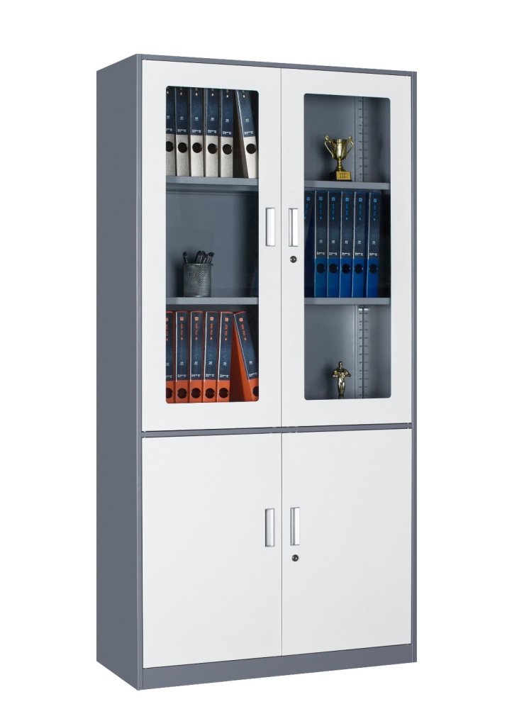 Skříň s prosklenými dveřmi z ocelového plechu tloušťky 0,6 mm. Výška 1800 x šířka 900 x hloubka 390 mm, 4x police, 2x cylindrický rozvorový zámek se dvěma klíči. Povrchová úprava práškovou barvou - korpus tmavě šedý, dveře bílé.