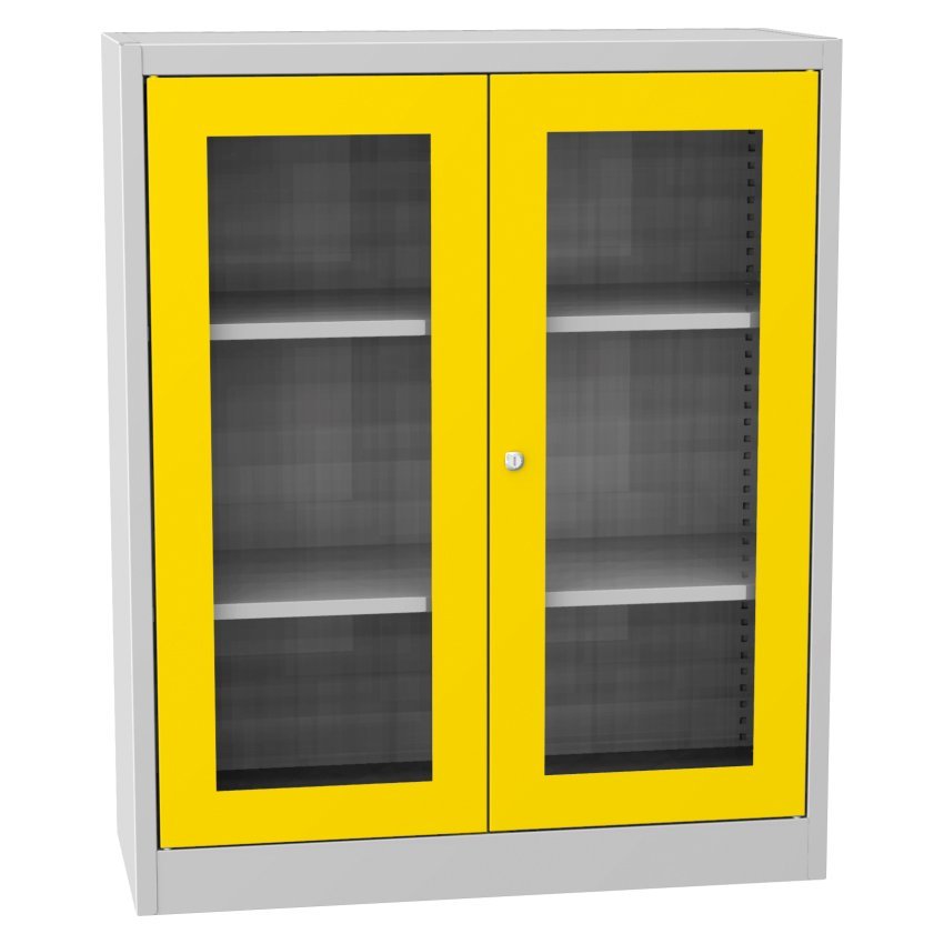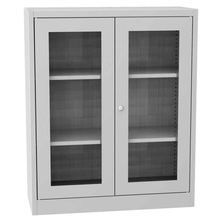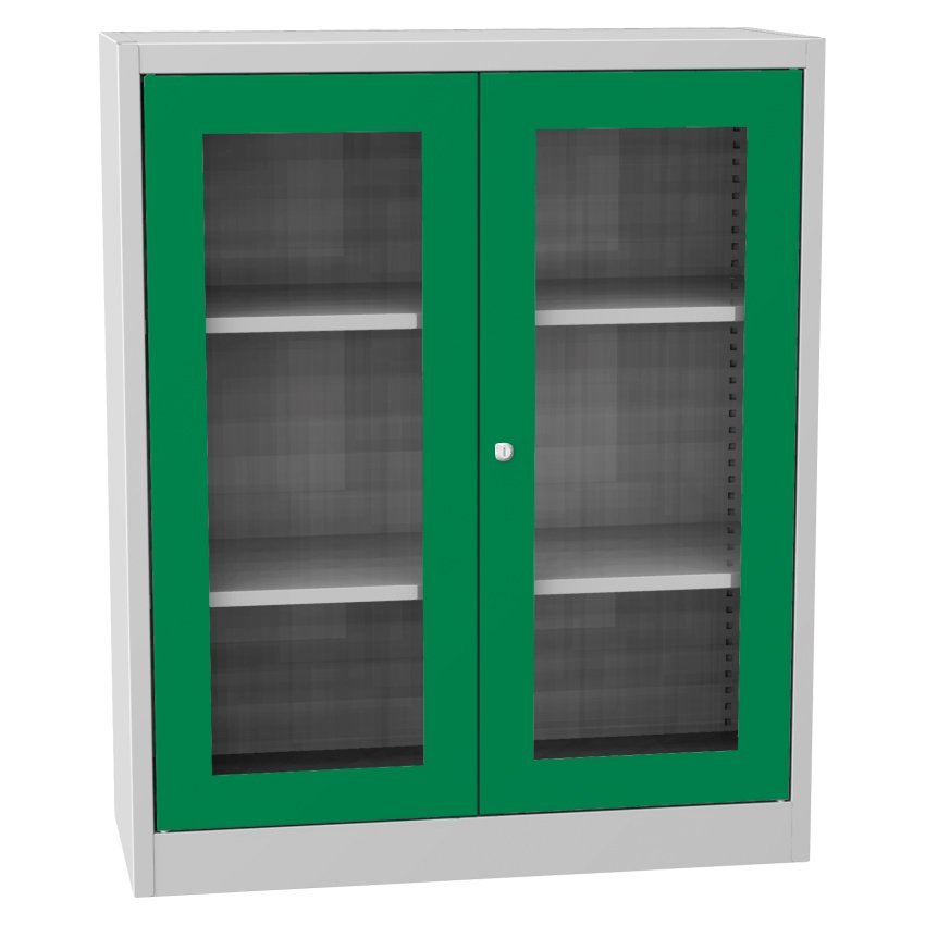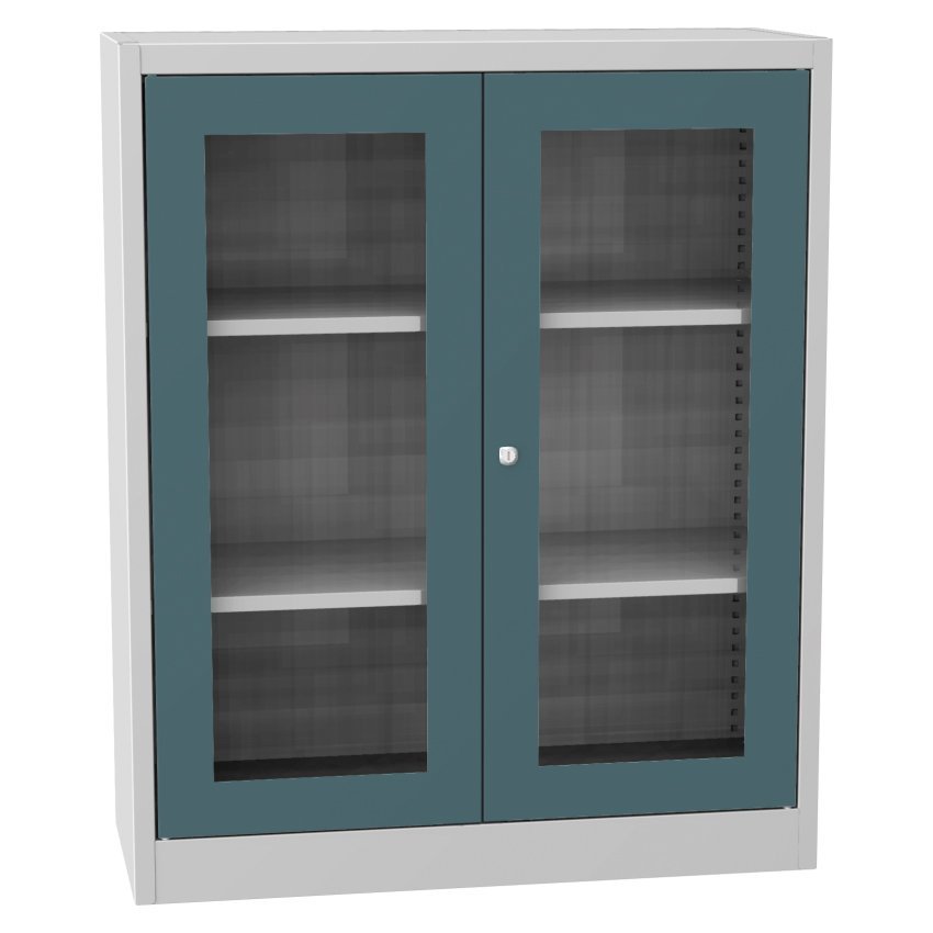 Dvoudveřová skříň se soklem a skleněnou výplní dveří, šířka 950, výška 1150, hloubka 400 mm, 2 police. Možnost náhrady dveří se skleněnou výplní dveřmi s drátěnou výplní nebo lamino dveřmi v odstínu buk, bříza nebo třešeň. Barva korpusu RAL 7035 světle šedá.