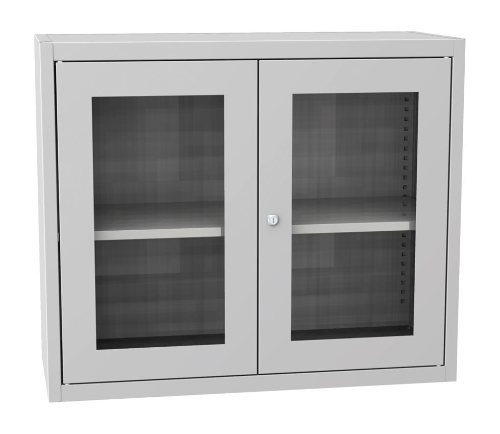 Dvoudveřová skříň se skleněnou výplní dveří - nástavec, šířka 950, výška 800, hloubka 400 mm, 1 police. Barva korpusu RAL 7035 světle šedá.