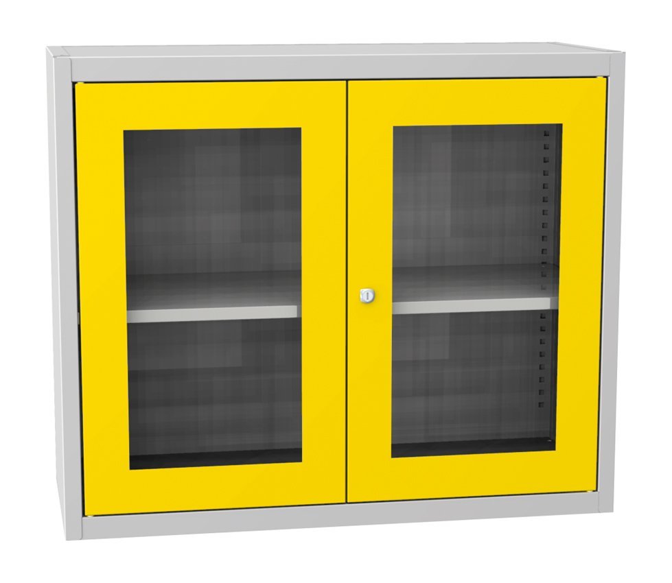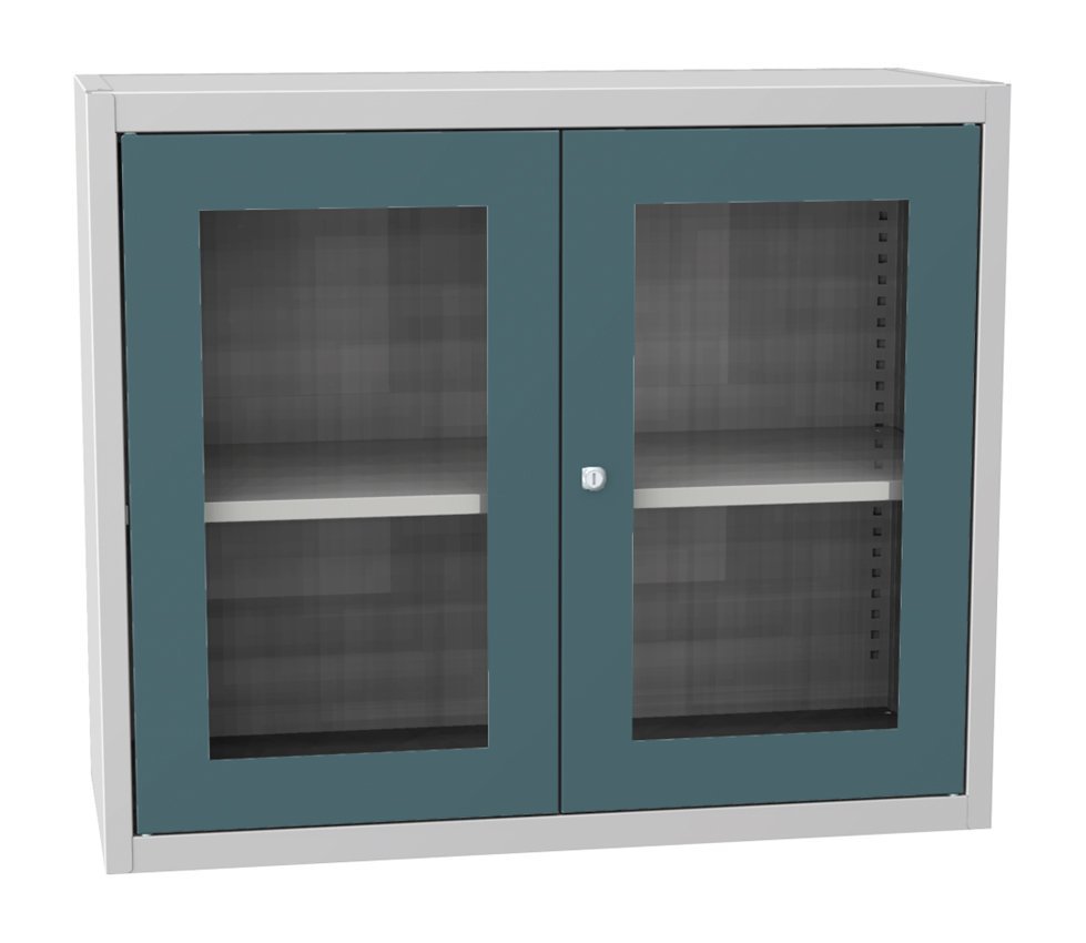 Dvoudveřová skříň se skleněnou výplní dveří - nástavec, šířka 950, výška 800, hloubka 400 mm, 1 police. Barva korpusu RAL 7035 celý popis a parametry