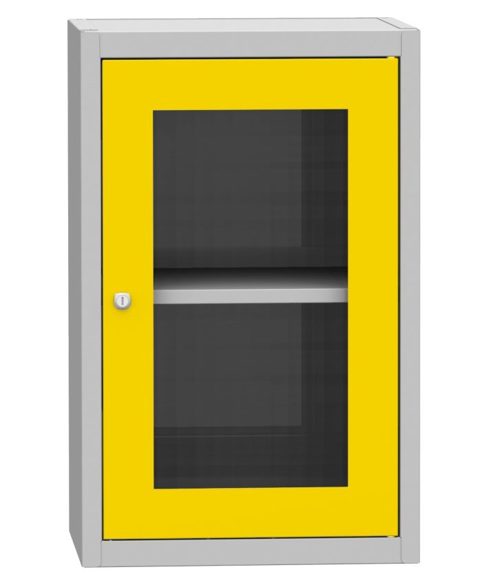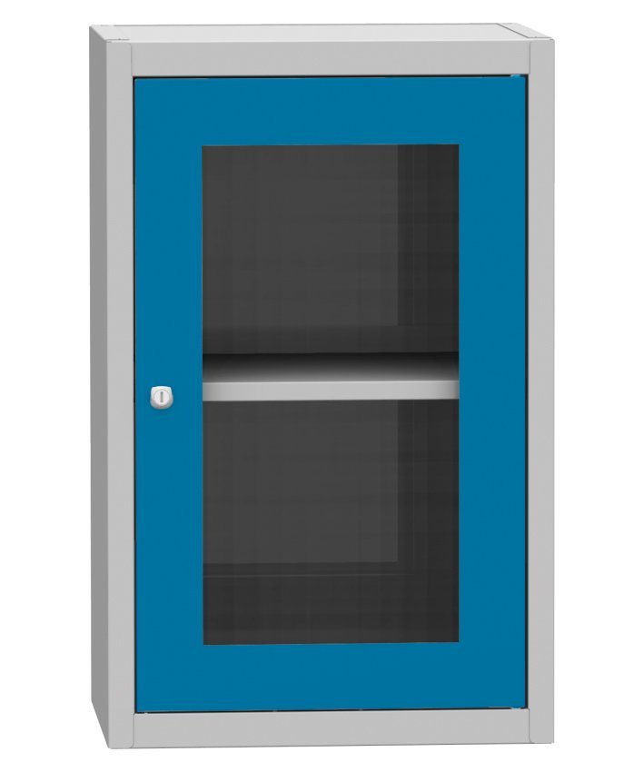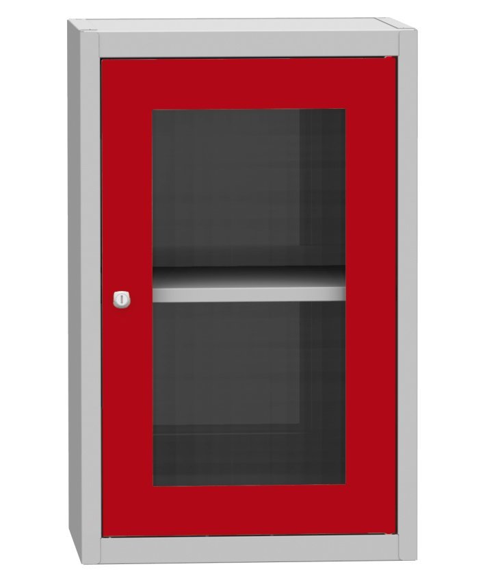 Skříň se skleněnými dveřmi, výška 800 x šířka 505 x hloubka 400 mm. Zamykání na cylindrický zámek s rozvorovým mechanismem. 1 x stavitelná ocelová police (nosnost 60 kg). Skleněné dveře jsou z tvrzeného skla.