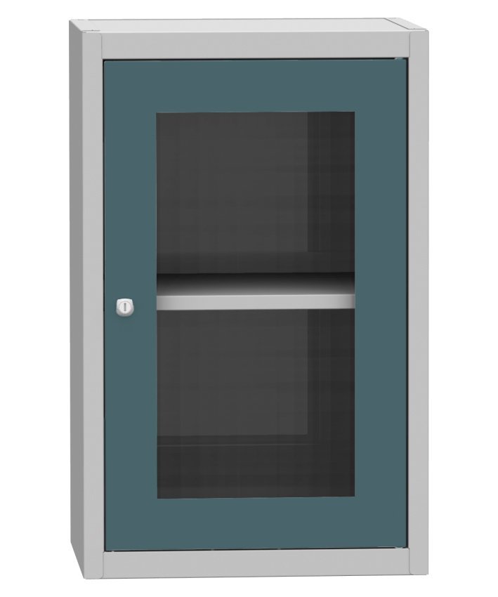 Skříň se skleněnými dveřmi, výška 800 x šířka 505 x hloubka 400 mm. Zamykání na cylindrický zámek s rozvorovým mechanismem. 1 x stavitelná ocelová police (nosnost 60 kg). Skleněné dveře jsou z tvrzeného skla. Barva korpusu RAL 7035 světle šedá.