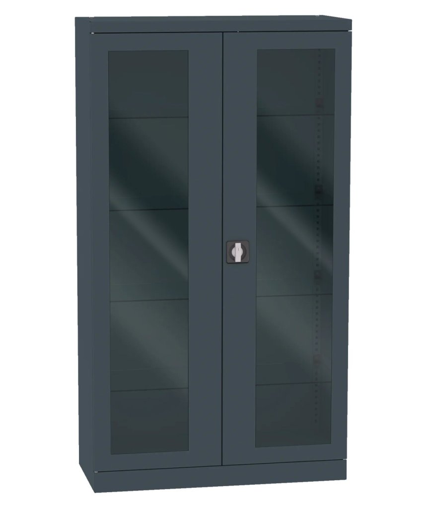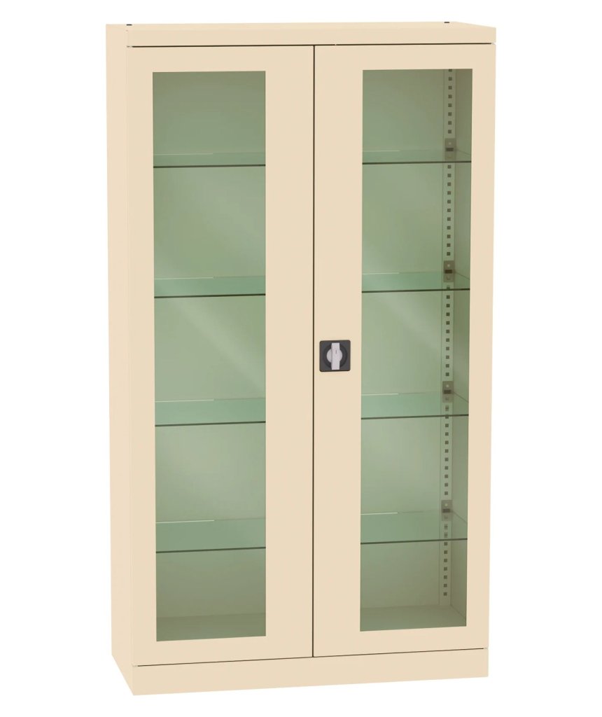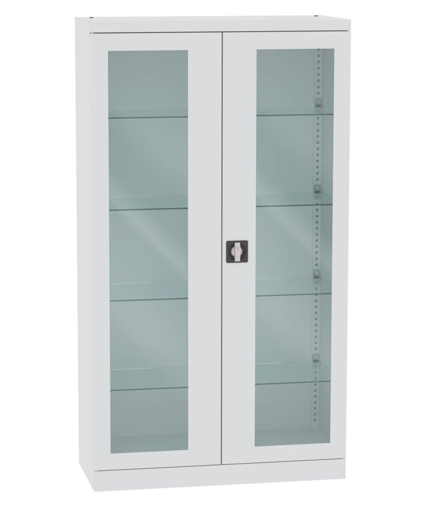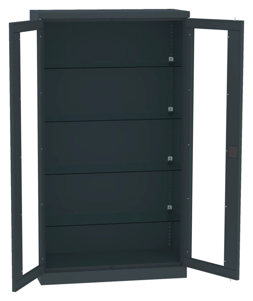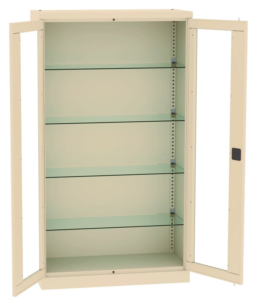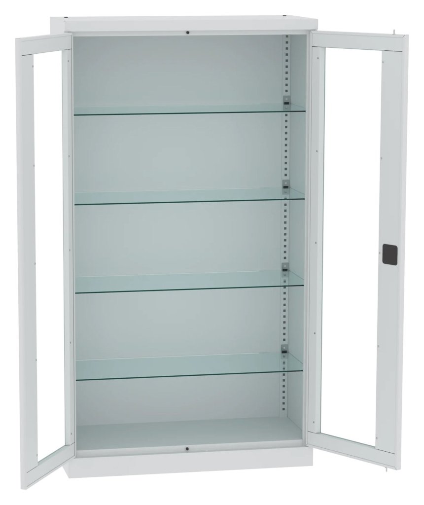 Skříň se skleněnými dveřmi a policemi, výška 1800 x šířka 1000 x hloubka 435 mm. Dvoubodový zámek. 4x stavitelná skleněná police (nosnost 25 kg) přestavitelná po 25 mm. Skleněné dveře i skleněné police jsou z tvrzeného skla.