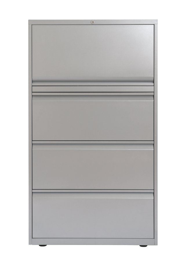 Skříň SystemFile se sklopnými dveřmi a čtyřmi zásuvkami pro závěsné pořadače a dokumenty A4. Výška 1947 - 1971, šířka 800, hloubka 470 mm.
