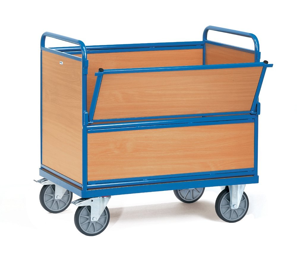 Skříňový vozík německé výroby, konstrukce ze svařované úhlové oceli. Ložná plocha a boční výplně z tvrdého materiálu na bázi dřeva. Přední a horní víko je do poloviny odklopné s možností zamknout na visací zámek. Užitná výška vozíku 800 mm. Barva modrá RAL 5007. 4 speciální pneumatická kolečka Fetra TPE, z toho 2 otočná s brzdou, 2 pevná.