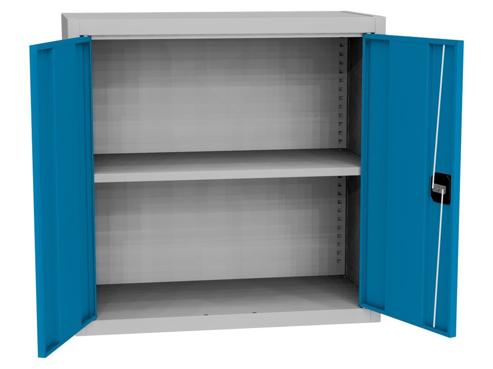Skříň s plnými dveřmi, výška 800 x šířka 505 x hloubka 400 mm. Zamykání na cylindrický zámek s rozvorovým mechanismem. 1 x stavitelná ocelová police (nosnost 60 kg). Možnost náhrady plných dveří dveřmi se skleněnou výplní, s drátěnou výplní nebo lamino dveřmi v odstínu buk, bříza nebo třešeň. Barva korpusu RAL 7035 světle šedá.