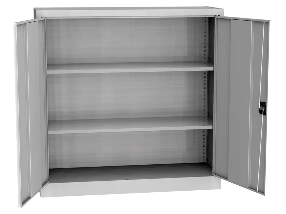 Dvoudveřová skříň se soklem, šířka 800, výška 1150, hloubka 400 mm, 2 police. Možnost náhrady plných dveří dveřmi se skleněnou výplní, s drátěnou výplní nebo lamino dveřmi v odstínu buk, bříza nebo třešeň. Barva korpusu RAL 7035 světle šedá.