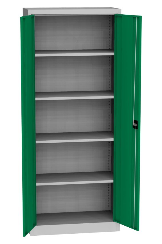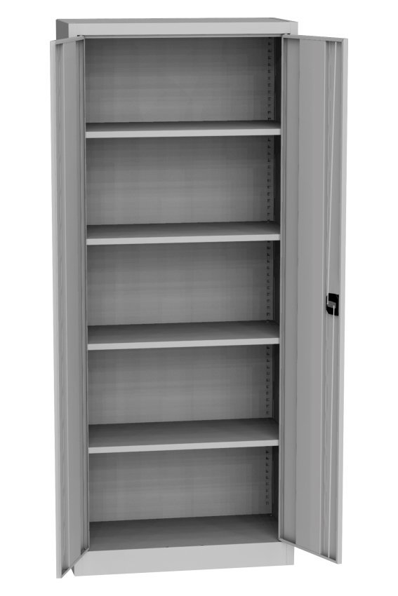 Dvoudveřová skříň se soklem, šířka 800, výška 1800, hloubka 400 mm, 4 police. Možnost náhrady plných dveří dveřmi se skleněnou výplní, s drátěnou výplní nebo lamino dveřmi v odstínu buk, bříza nebo třešeň. Barva korpusu RAL 7035 světle šedá.