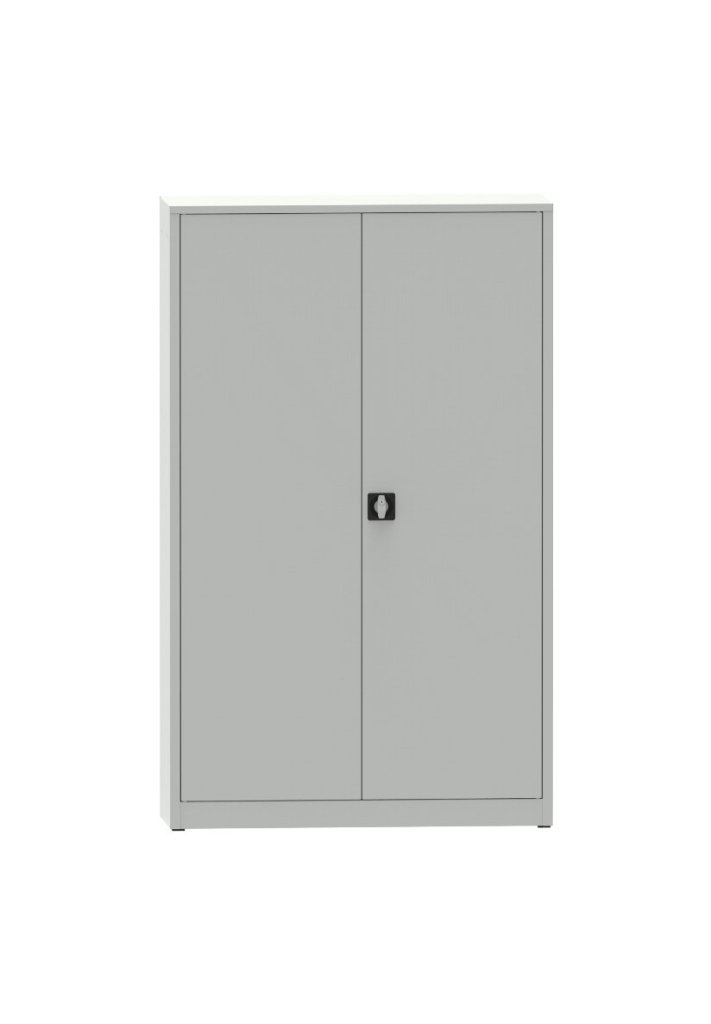 Dvoudveřová skříň se soklem, šířka 1200, výška 1950, hloubka 400 mm, 4 police. Možnost náhrady plných dveří dveřmi se skleněnou výplní, s drátěnou výplní nebo lamino dveřmi v odstínu buk, bříza nebo třešeň. Barva korpusu RAL 7035 světle šedá.
