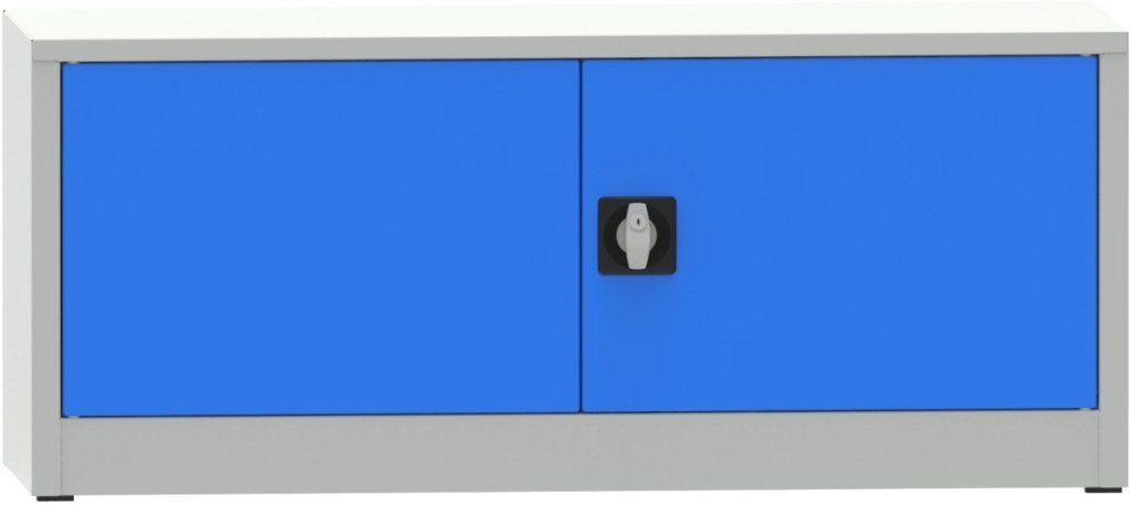 Dvoudveřová kovová svařovaná skříň, šířka 1200, výška 500, hloubka 500 mm. Barva korpusu RAL 7035 světle šedá, dveří RAL 7035 světle šedá a RAL 5012 modrá.