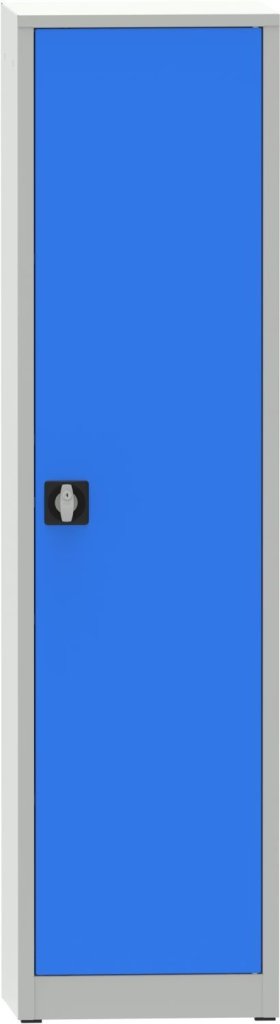 Skříň s plnými dveřmi, výška 1950 x šířka 505 x hloubka 400 mm. Zamykání na cylindrický zámek s rozvorovým mechanismem. 4 x stavitelná ocelová police (nosnost 60 kg). Možnost náhrady plných dveří dveřmi se skleněnou výplní, s drátěnou výplní nebo lamino dveřmi v odstínu buk, bříza nebo třešeň. Barva korpusu RAL 7035 světle šedá.