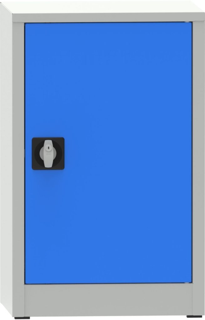 Kovová svařovaná skříň, šířka 508, výška 800, hloubka 500 mm, 1x přestavitelná police. Barva korpusu RAL 7035 světle šedá, dveří RAL 7035 světle šedá a RAL 5012 modrá.