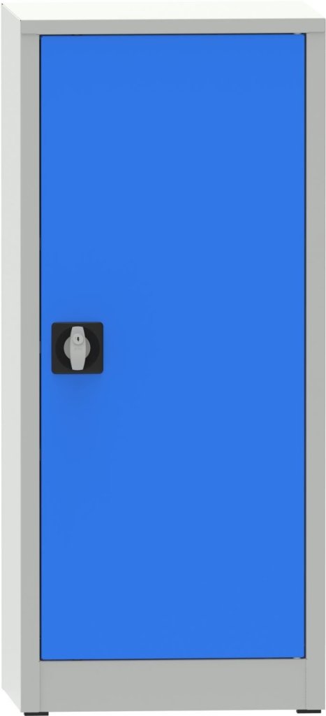 Kovová svařovaná skříň, šířka 508, výška 1150, hloubka 600 mm, 2x přestavitelná police. Barva korpusu RAL 7035 světle šedá, dveří RAL 7035 světle šedá a RAL 5012 modrá.