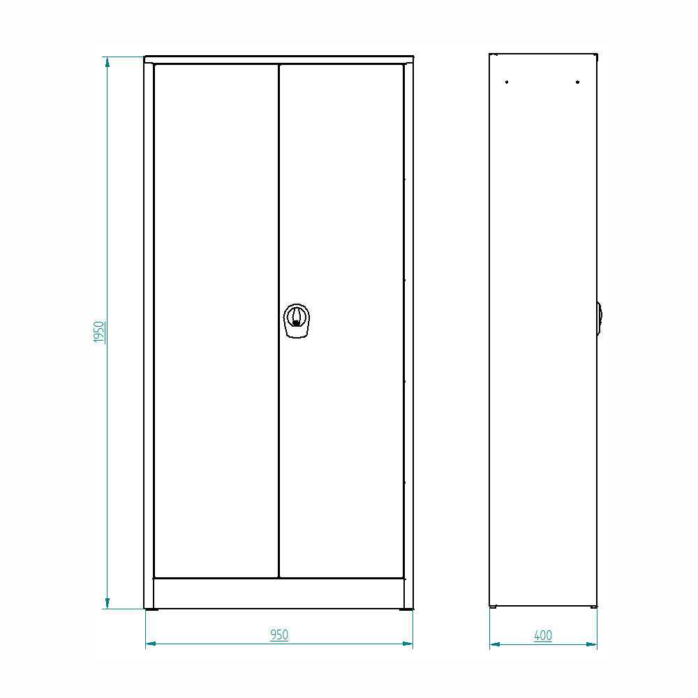 Dvoudveřová kovová skříň se čtyřmi policemi, šířka 950, výška 1950, hloubka 400 mm. Možnost náhrady plných dveří dveřmi se skleněnou výplní, s drátěnou výplní nebo lamino dveřmi v odstínu buk, bříza nebo třešeň. Barva korpusu RAL 7035 světle šedá. Skladem pouze v provedení s ocelovými dveřmi, ostatní varianty na objednávku. Skladem v barvě světle šedé.