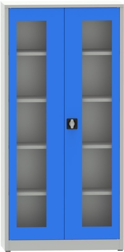 Dvoudveřová kovová svařovaná skříň s prosklenými dveřmi plexisklem, šířka 950, výška 1950, hloubka 400 mm, 4x přestavitelná police. Barva korpusu RAL 7035 světle šedá, dveří RAL 7035 světle šedá a RAL 5012 modrá.