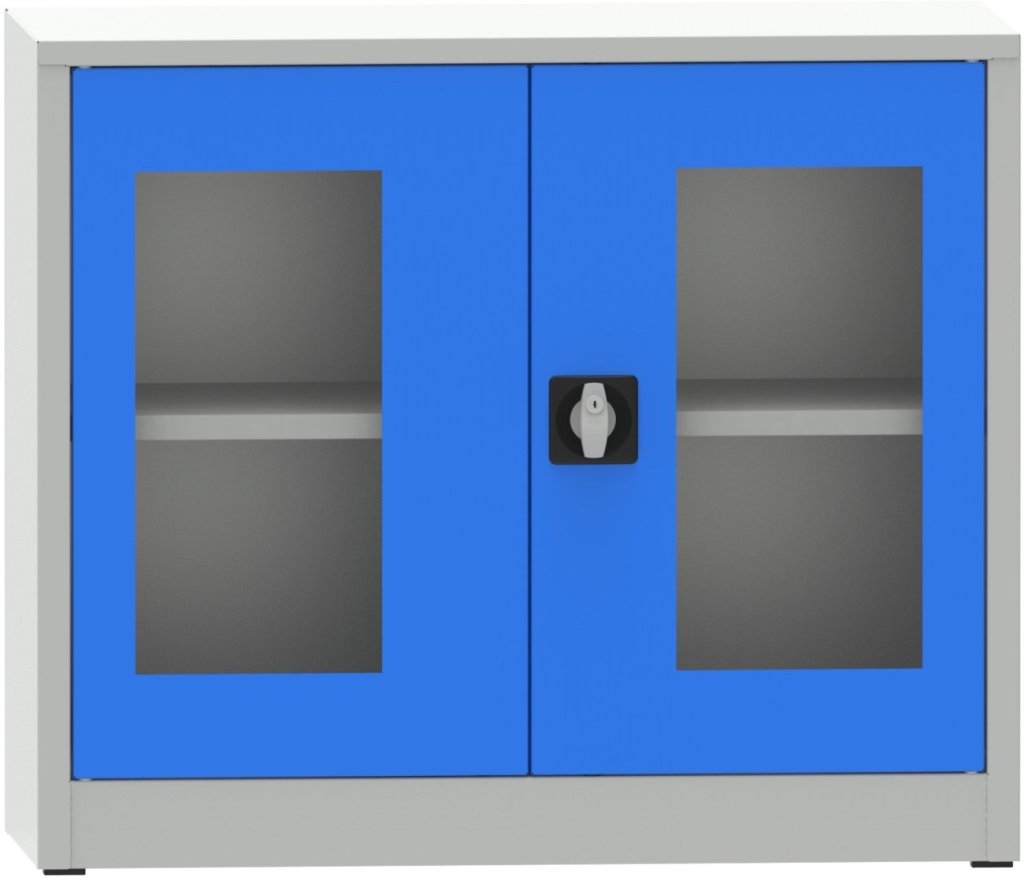 Dvoudveřová kovová svařovaná skříň s prosklenými dveřmi plexisklem, šířka 950, výška 800, hloubka 400 mm, 1x přestavitelná police. Barva korpusu RAL 7035 světle šedá, dveří RAL 7035 světle šedá a RAL 5012 modrá.