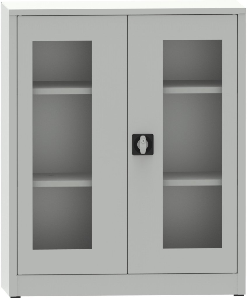 Dvoudveřová kovová svařovaná skříň s prosklenými dveřmi plexisklem, šířka 950, výška 1150, hloubka 600 mm, 2x přestavitelná police. Barva korpusu RAL 7035 světle šedá, dveří RAL 7035 světle šedá a RAL 5012 modrá.