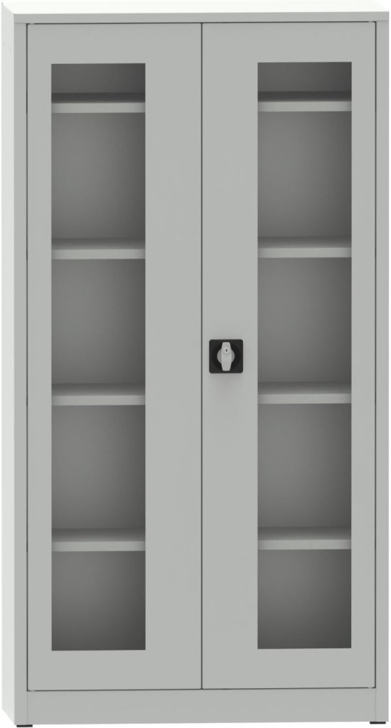 Dvoudveřová kovová svařovaná skříň s prosklenými dveřmi plexisklem, šířka 950, výška 1800, hloubka 600 mm, 4x přestavitelná police. Barva korpusu RAL 7035 světle šedá, dveří RAL 7035 světle šedá a RAL 5012 modrá.