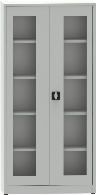 Dvoudveřová kovová svařovaná skříň s prosklenými dveřmi plexisklem, šířka 950, výška 1950, hloubka 500 mm, 4x přestavitelná police. Barva korpusu RAL 7035 světle šedá, dveří RAL 7035 světle šedá a RAL 5012 modrá.