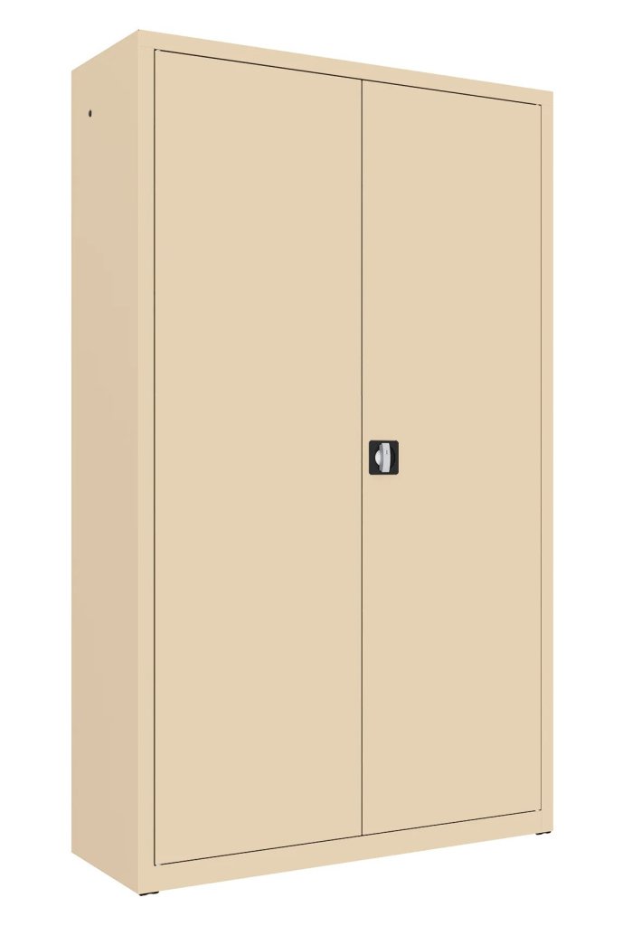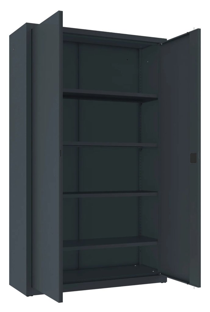 Dvoudveřová kovová skříň se čtyřmi policemi, šířky 1200 mm (viz varianty produktu), výška 1990, hloubka 435 mm. Dvoubodový rozvorový zámek, různé barvy.