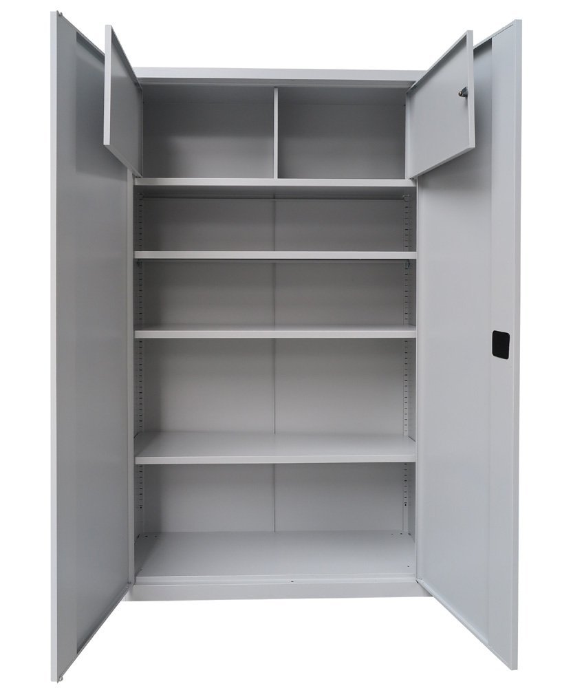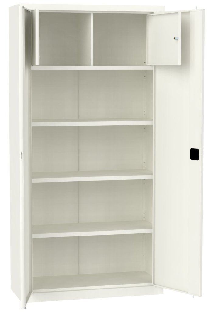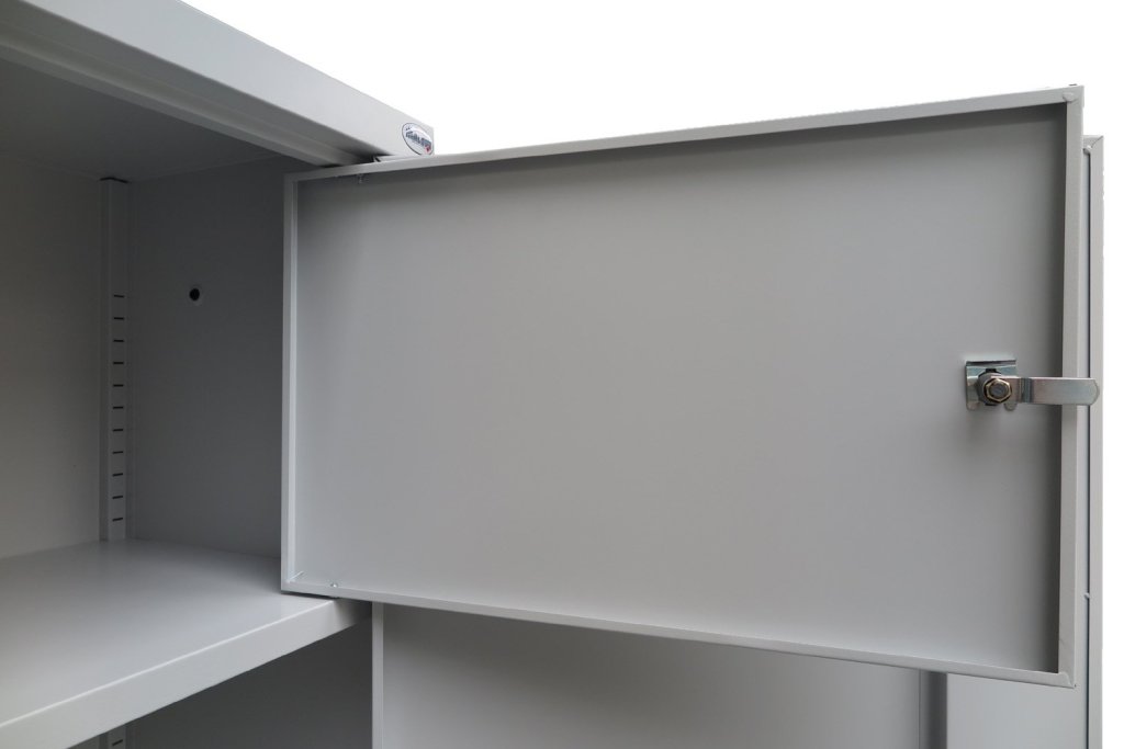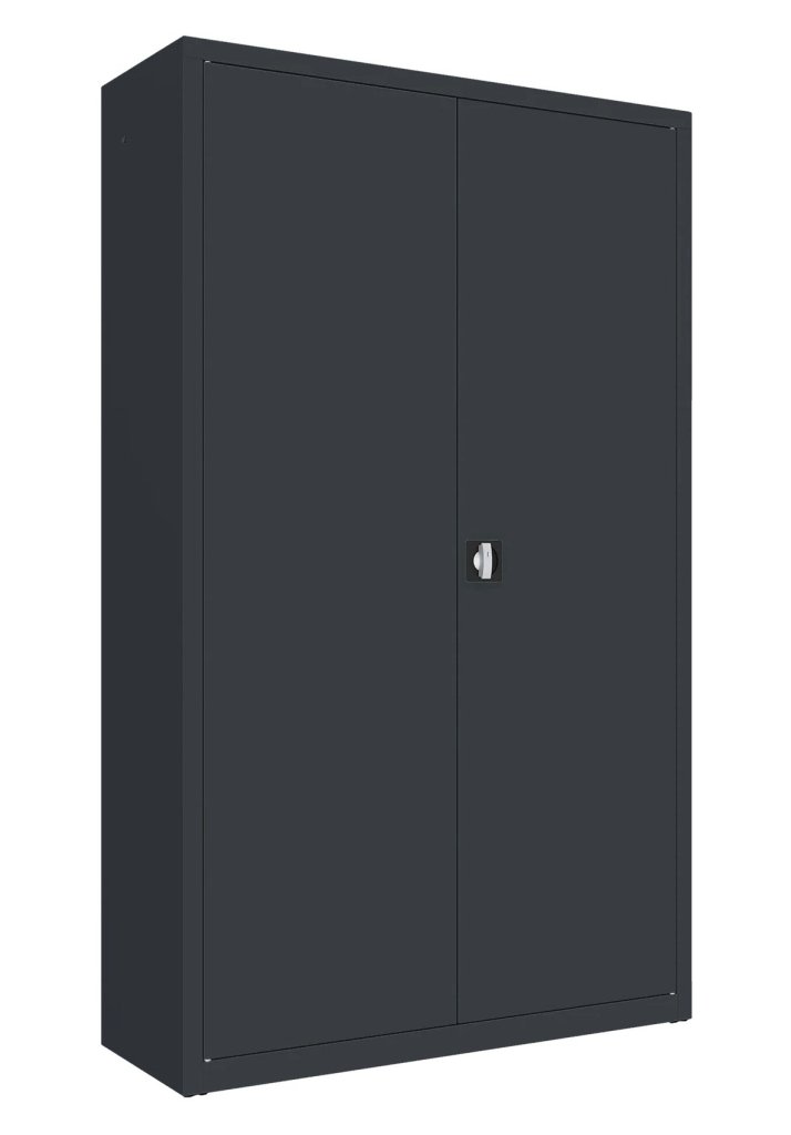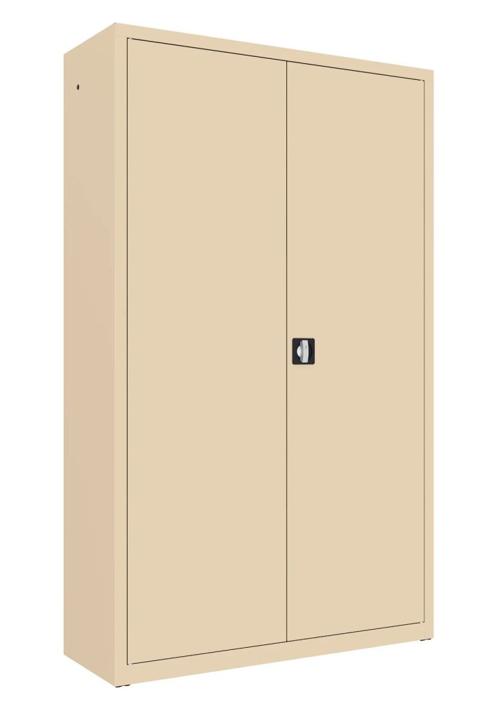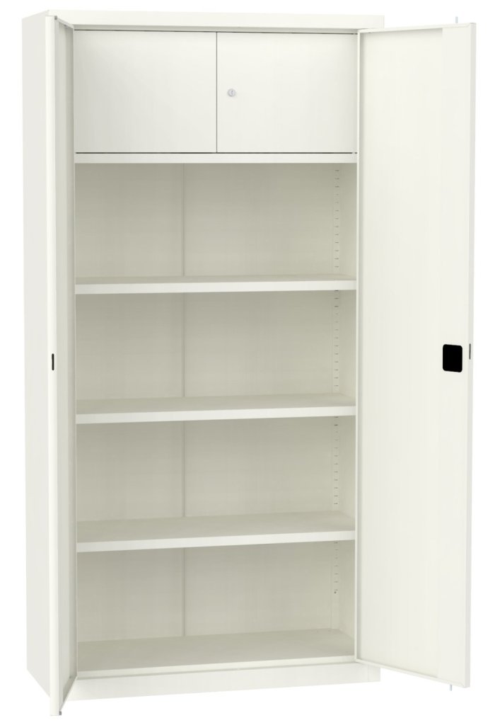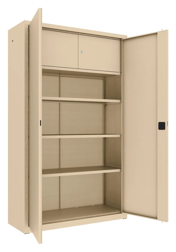 Dvoudveřová kovová skříň se třemi policemi a vnitřní dělenou uzamykatelnou schránkou, šířky 1200 mm (viz varianty produktu), výška 1990, hloubka 435 mm. Dvoubodový rozvorový zámek, různé barvy.