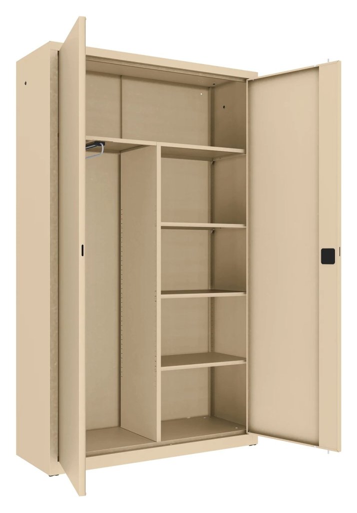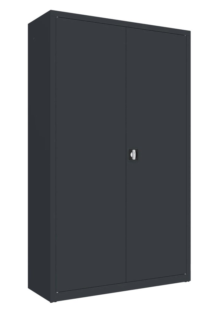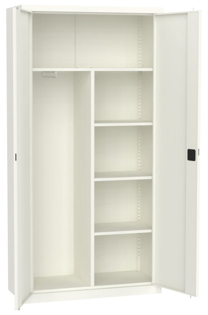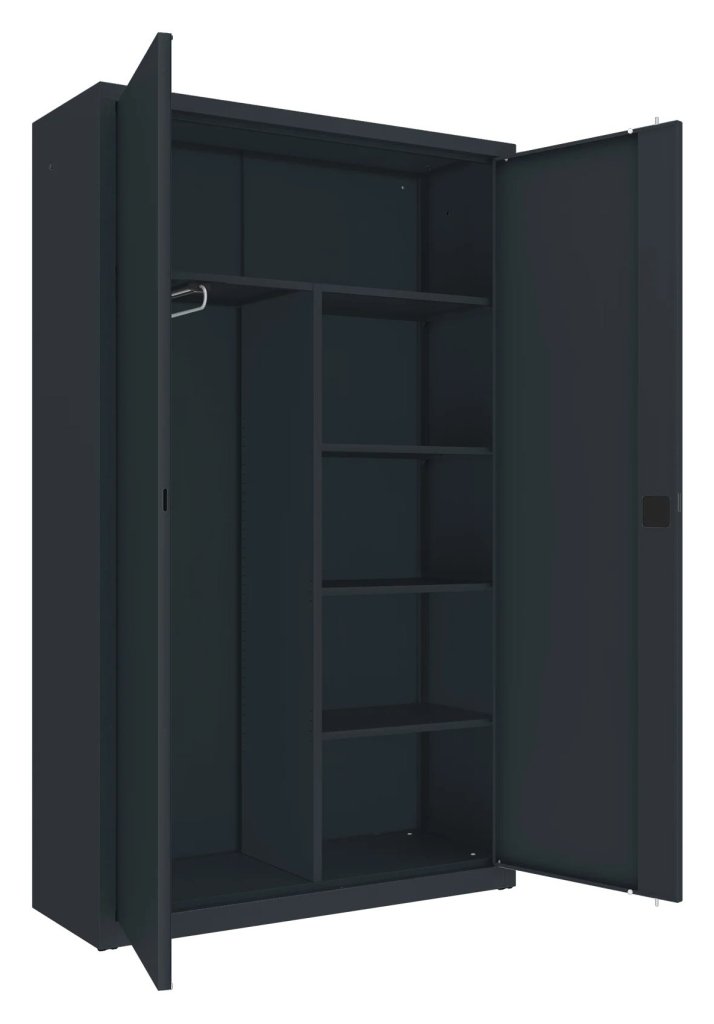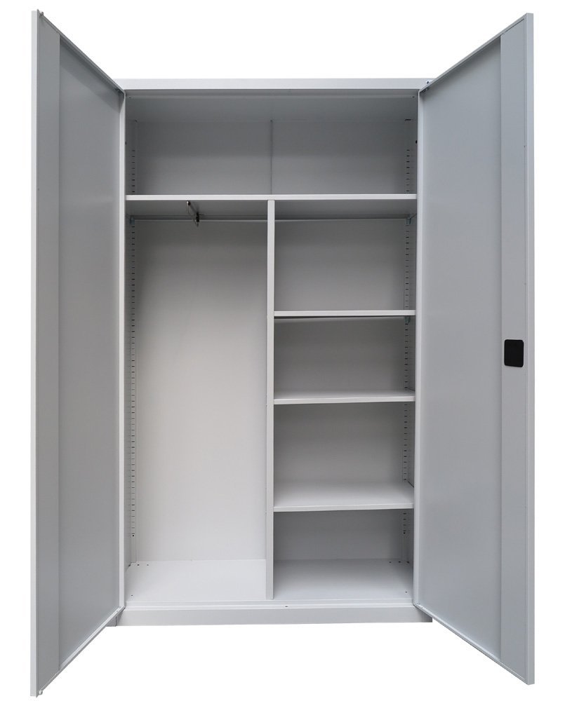 Dvoudveřová kovová skříň se čtyřmi policemi a šatním oddílem s výsuvnou tyčí pro zavěšení ramínek, šířka 1200 mm (viz varianty produktu), výška 1990, hloubka 435 mm. Dvoubodový rozvorový zámek, různé barvy.
