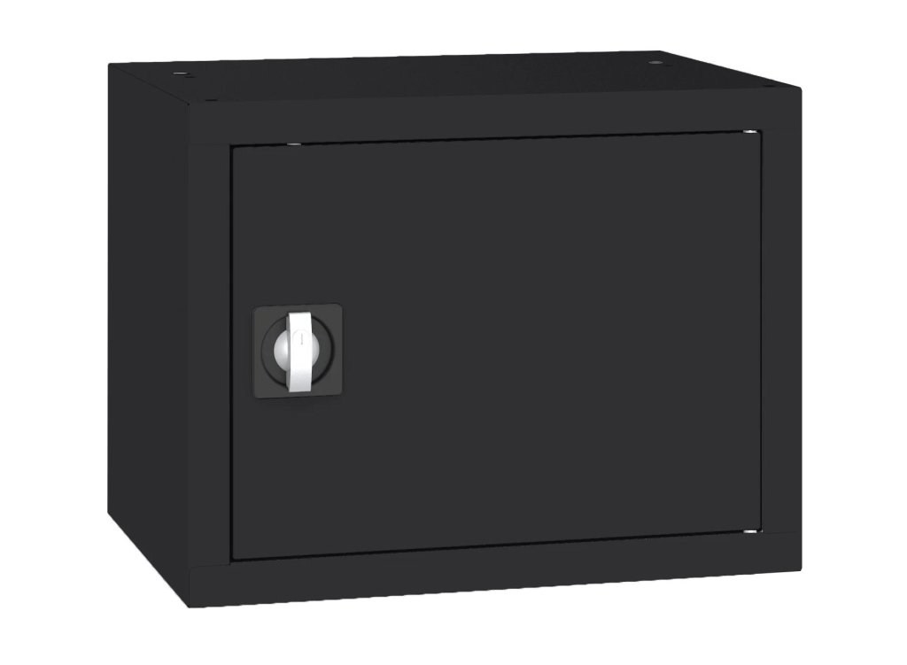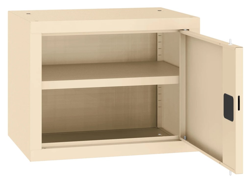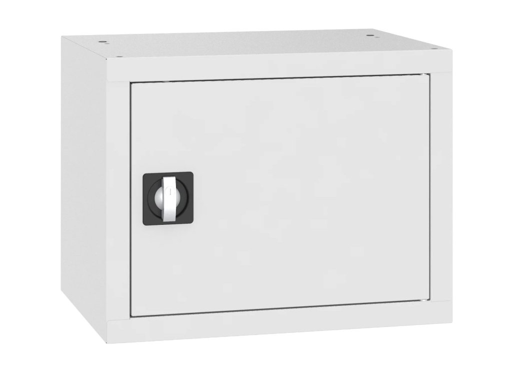 Jednodveřová kovová skříň s jednou policí, vhodná jako nástavec. Šířka 600 mm, výška 465, hloubka 435 mm. Dvoubodový rozvorový zámek, různé barvy.