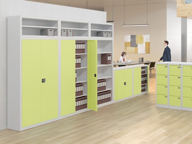 Dvoudveřová kovová skříň s jednou policí, vhodná jako nástavec. Šířka 800 mm, výška 465, hloubka 435 mm. Dvoubodový rozvorový zámek, různé barvy.