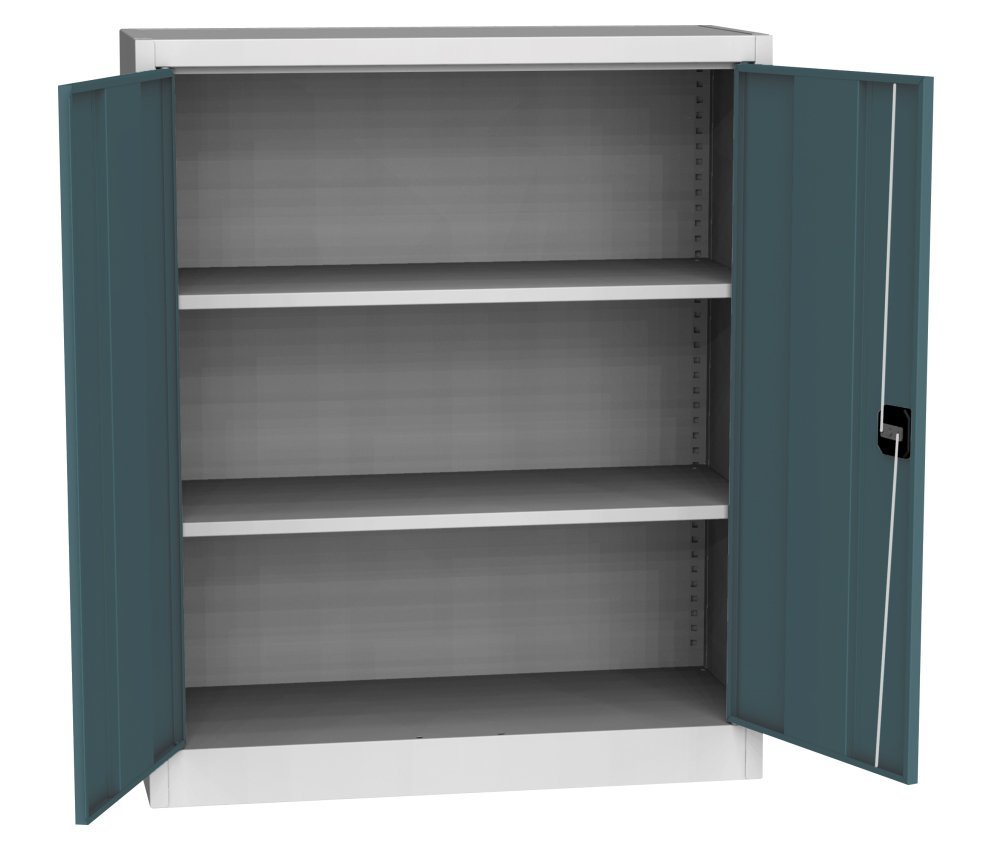 Dvoudveřová skříň se soklem, šířka 1200, výška 1150, hloubka 400 mm, 2 police. Možnost náhrady plných dveří dveřmi se skleněnou výplní, s drátěnou výplní nebo lamino dveřmi v odstínu buk, bříza nebo třešeň. Barva korpusu RAL 7035 světle šedá.