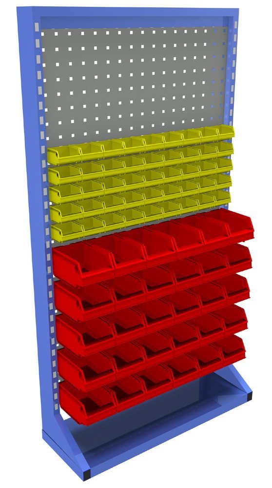 Stacionární jednostranný panel s vybavením. Konstrukce stojanu je tvořena robustním rámem s kovovými perforovanými stěnami pro zavěšení plastových boxů a držáků nářadí. Rám je lakován odolnou práškovou barvou, perforované panely jsou pozinkované nebo lakované odolnou práškovou barvou.