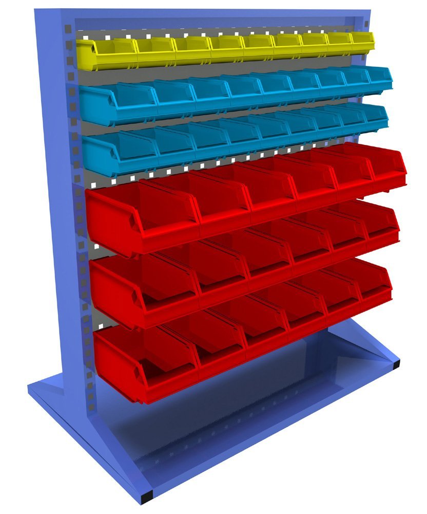 Stacionární oboustranný panel s vybavením. Konstrukce stojanu je tvořena robustním rámem s kovovými perforovanými stěnami pro zavěšení plastových boxů. Rám je lakován odolnou práškovou barvou, perforované panely jsou pozinkované nebo lakované odolnou práškovou barvou.