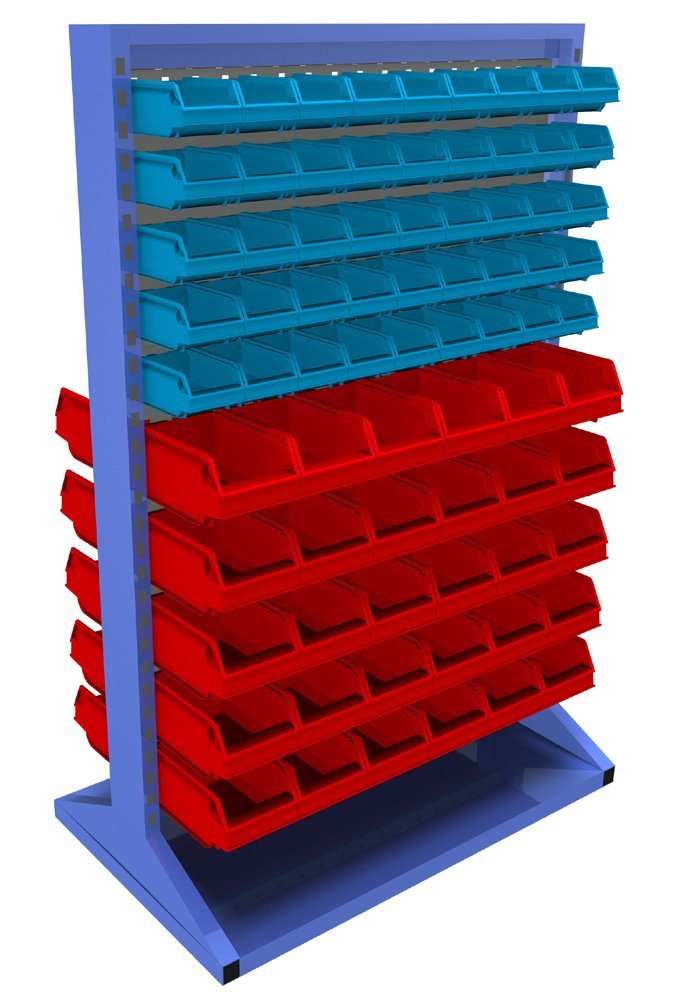 Stacionární oboustranný panel s vybavením. Konstrukce stojanu je tvořena robustním rámem s kovovými perforovanými stěnami pro zavěšení plastových boxů. Rám je lakován odolnou práškovou barvou, perforované panely jsou pozinkované nebo lakované odolnou práškovou barvou.