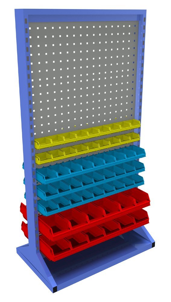 Stacionární oboustranný panel s vybavením. Konstrukce stojanu je tvořena robustním rámem s kovovými perforovanými stěnami pro zavěšení plastových boxů a držáků nářadí. Rám je lakován odolnou práškovou barvou, perforované panely jsou pozinkované nebo lakované odolnou práškovou barvou.