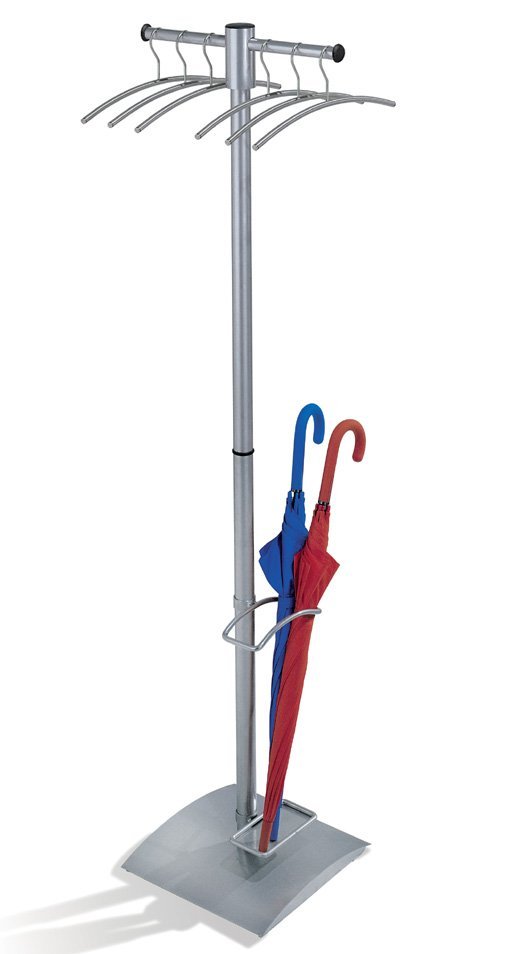 Stabilní kovová základna. Součástí stojanu je držák na deštníky a 6 ramínek. Barva stříbrná. Rozměry v mm (V x Š x H) 1680 x 510 x 460.