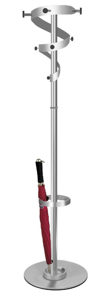 Kovový věšák New Public, v dolní části šedá plastová miska + plastový kryt „zátěžového podstavce“, v horní části plastové 4 ks háčků na kabáty. Díky těžké základně je velmi stabilní. Výška 1770 mm, průměr základny 400 mm. Povrchová úprava práškovým lakem v barvě šedé matné, háčky kombinace šedá/černá.