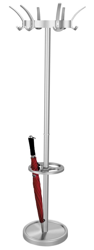 Kovový stojanový věšák Solitaire, výška 1750 mm, průměr 335 mm, 8x háček, s integrovaným držákem deštníků. Povrchová úprava práškovým lakem v barvě stříbrné RAL 9006.