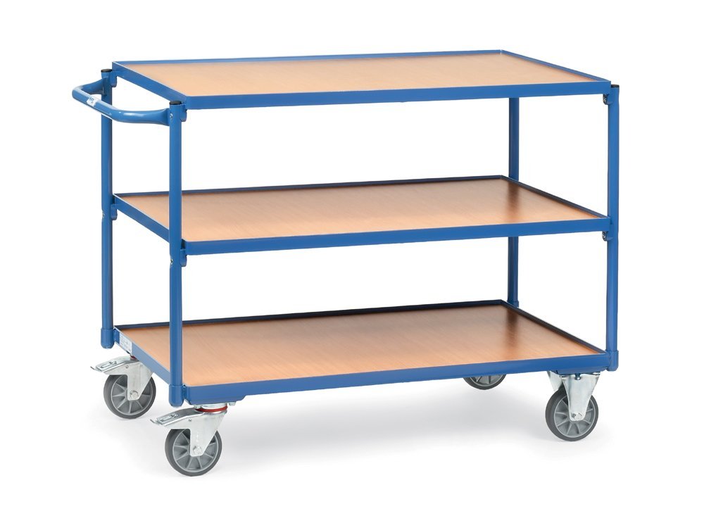 Stolní vozík německé výroby třípatrový s nosností 500 kg. Nosnost horní police 200 kg. Ocelová konstrukce rámu vyrobená z jednoho kusu se zaoblenými rohy. Ložná plocha ze dřeva. Výška ložné plochy od země 220mm, výška střední police 550 mm a výška horní police 865 mm. 4 speciální pneumatická kolečka Fetra TPE, z toho 2 otočná s brzdou, 2 pevná. Totalstop - centrální brzdový systém Fetra.
