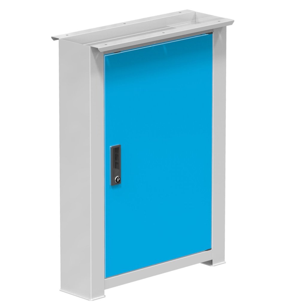 Stolová noha pro pracovní stoly, šířka nohy 150 mm, výška 840 mm, hloubka 603 nebo 703 mm. Uzamykatelná dvířka + 1x stavitelná police, nosnost 800 kg.