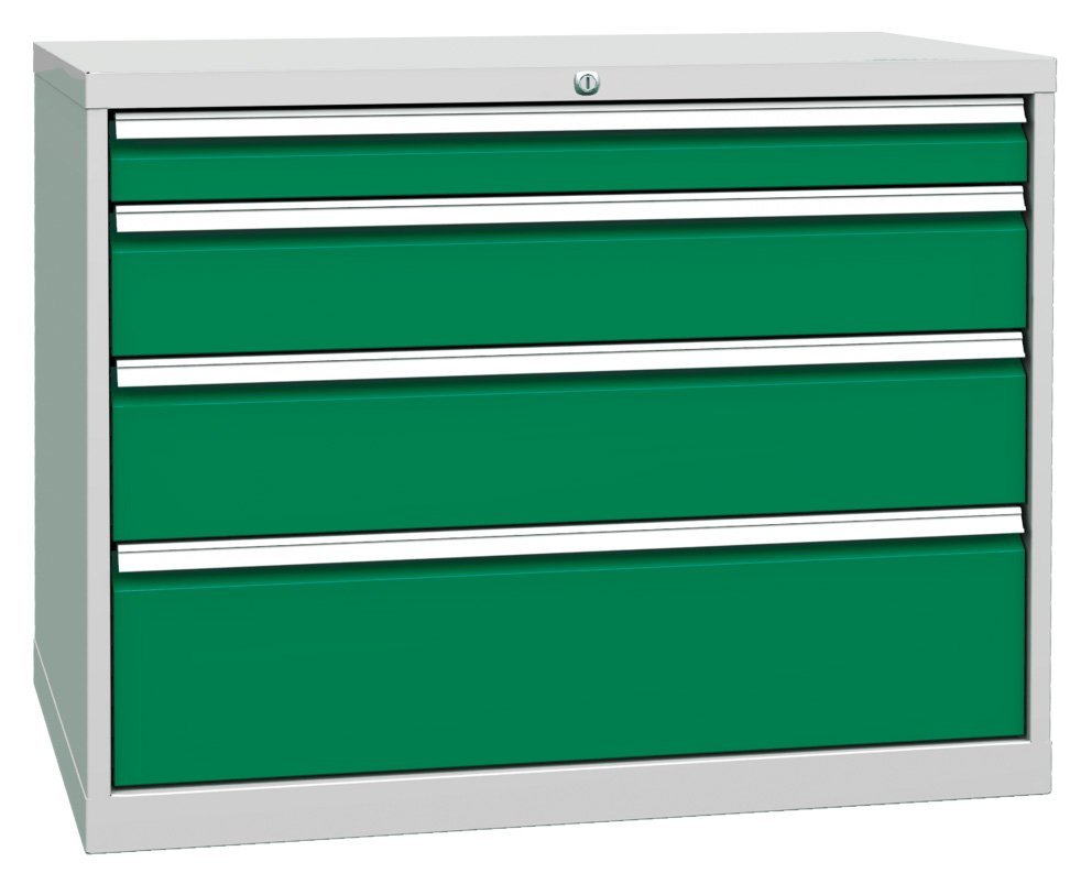 Čtyřzásuvkový kontejner pracovního stolu, šířka 1000, výška 810, hloubka 700 mm. 1x zásuvka 90, 1x 150, 1x 180, 1x 240 mm. Barva korpusu RAL 7035 světle šedá.