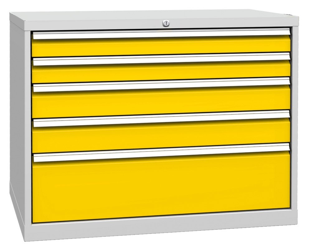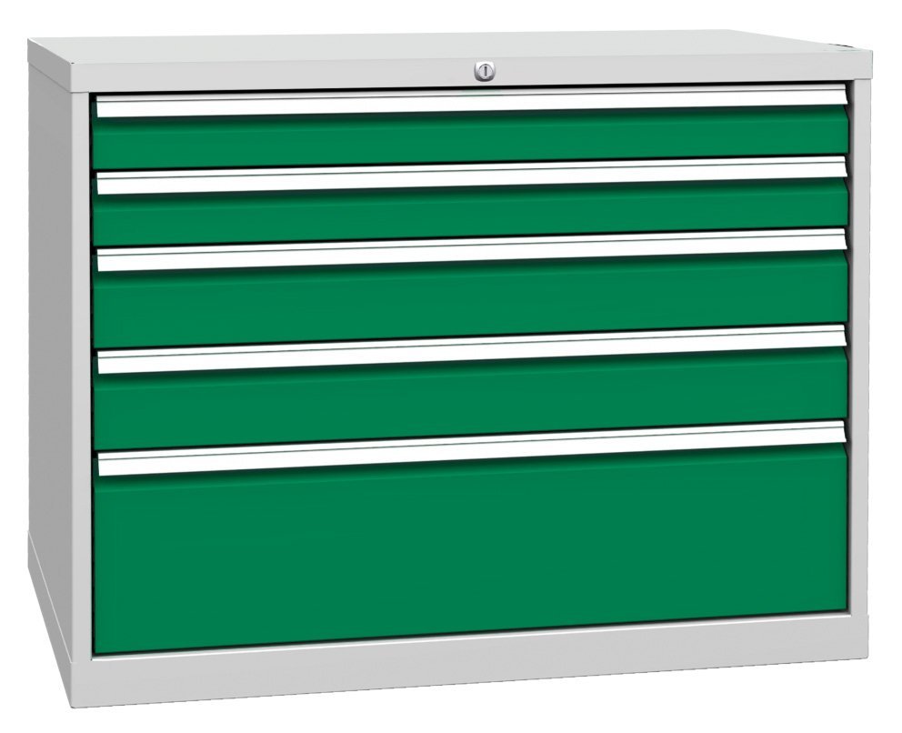 Pětizásuvkový kontejner pracovního stolu, šířka 1000, výška 810, hloubka 700 mm. 2x zásuvka 90, 2x 120, 1x 240 mm. Barva korpusu RAL 7035 světle šedá.
