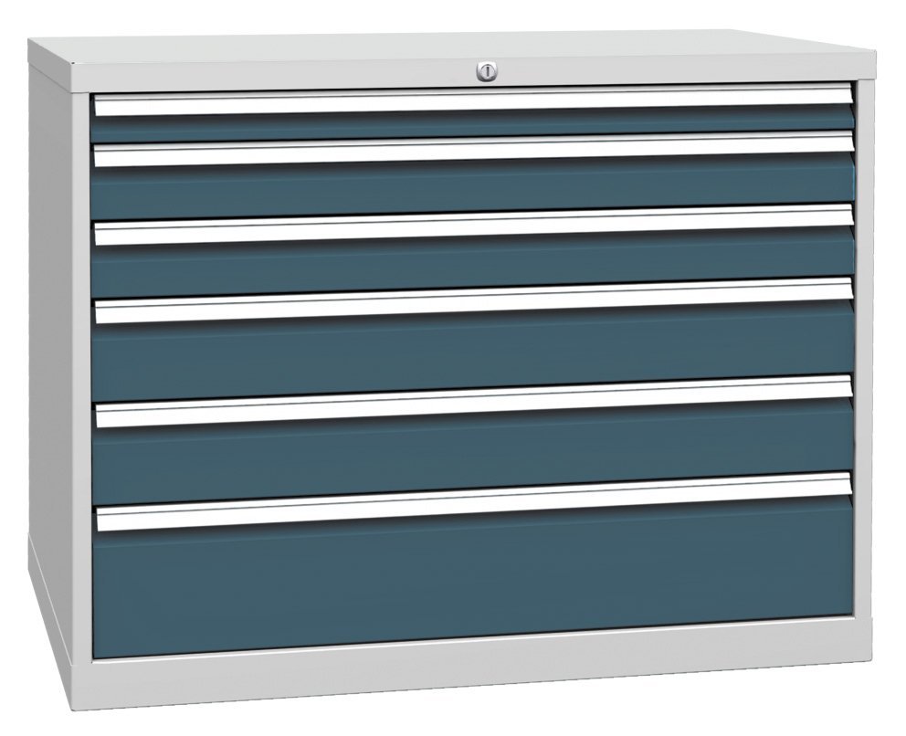 Šestizásuvkový kontejner pracovního stolu, šířka 1000, výška 810, hloubka 700 mm. 1x zásuvka 60, 2x 90, 2x 120, 1x 180 mm. Barva korpusu RAL 7035 světle šedá.