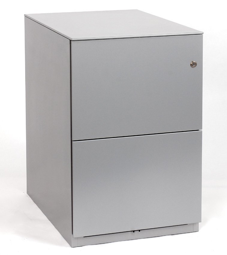 Kancelářské kontejnery mobilní, centrální zámek, jedna standardní zásuvka, jedna na závěsné pořadače. Výška 495 nebo 501, šířka 420, hloubka 565 mm. Páté kolečko na spodní hraně hluboké zásuvky zajišťuje stabilitu i při jejím úplném otevření. Varianta bez horní desky nebo s horní dekorativní deskou tloušťky 6 mm. Výsuv standardní zásuvky 80 nebo 100%, výsuv vysoké zásuvky 100%.