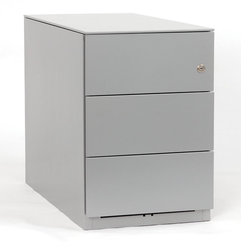Kancelářské kontejnery mobilní úzké, centrální zámek, jedna standardní zásuvka, jedna na závěsné pořadače. Výška 495 nebo 501, šířka 300, hloubka 565 mm. Páté kolečko na spodní hraně hluboké zásuvky zajišťuje stabilitu i při jejím úplném otevření. Varianta bez horní desky nebo s horní dekorativní deskou tloušťky 6 mm. Výsuv standardní zásuvky 80 nebo 100%, výsuv vysoké zásuvky 100%.