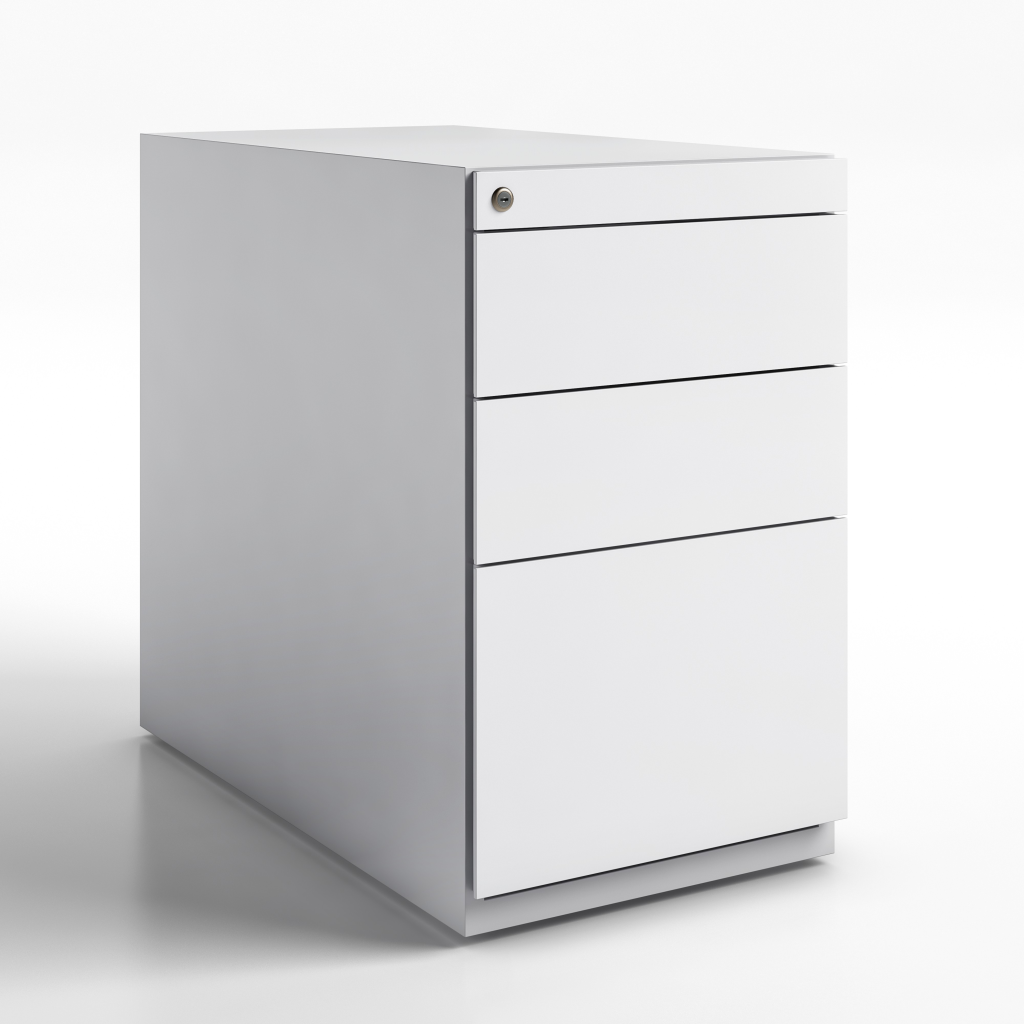 Kancelářské kontejnery přístavné nebo pod stolovou desku, centrální zámek, dvě standardní zásuvky, jedna na závěsné pořadače. Výška 698 - 718, šířka 420, hloubka 775 mm. Varianta bez horní desky. Výsuv standardních zásuvek 80 nebo 100%, výsuv vysoké zásuvky 100%.