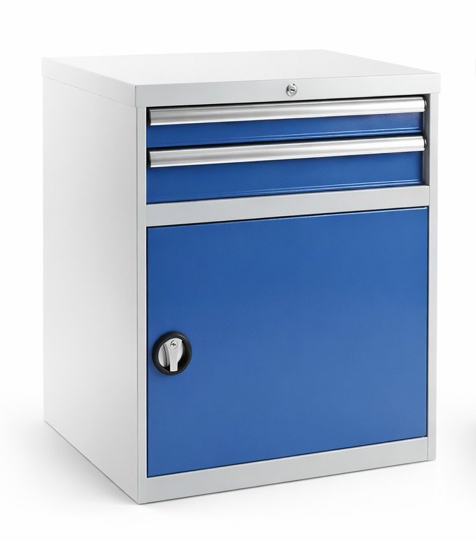 Dvouzásuvkový kontejner pracovního stolu s dveřm, šířka 717, výška 800, hloubka 727 mm, 1x zásuvka 75, 1x 100 mm, 1x police. Barva korpusu RAL 7035 světle šedá, barva zásuvek RAL 5012 modrá.